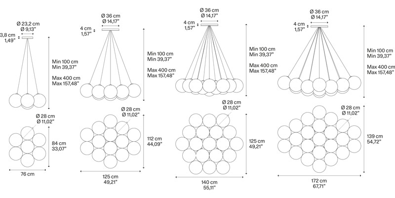 Random Cloud saisit l’essence de la raison pour laquelle les nuages ne cessent de nous fasciner : volumineux, légers et fluctuants à la fois. Random Cloud redécouvre le concept de lustre dans une touche contemporaine et enrichit la collection en termes de fonctionnalité. Les multiples compositions et configurations au choix des utilisateurs font de Random Cloud une option polyvalente pour les environnements domestiques, hôteliers et de bureau. Random Cloud n’a pas seulement été créé comme un élément décoratif et percutant, mais est aussi un lustre hautement fonctionnel et performant avec une émission lumineuse atteignant 11040 lumen. Chaque option de composition peut être obtenue avec des sphères de 23 ou 28 cm de diamètre, en choisissant l’une des sept finitions disponibles, offrant ainsi différentes solutions décoratives pouvant s’adapter à n’importe quel contexte ou style.