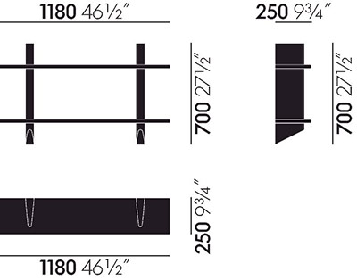Les bibliothèques à fixer au mur étaient courantes dans les intérieurs de la première moitié du XXe siècle. Jean Prouvé a lui aussi conçu un certain nombre d’étagères murales, comme la Rayonnage Mural produit par Vitra, qui a été conçu à l’origine en 1936 pour l’École nationale professionnelle de la ville de Metz. Les deux support muraux verticaux de Rayonnage Mural sont réalisés en tôle pliée peinte. Avec leur forme aérodynamique qui rappelle le gouvernail d’un avion ou d’un navire, ils sont un élément récurrent des créations de Prouvé. Les supports muraux présentent des fentes horizontales réalisées avec précision dans lesquelles sont insérées les étagères en bois massif. Ces deux matériaux à fort contraste forment ensemble une étagère pratique qui possède les qualités sculpturales d’un objet esthétique. Les étagères en bois se décline en chêne clair ou foncé, tandis que les support muraux sont disponibles dans différentes couleurs originales de Prouvé.