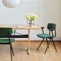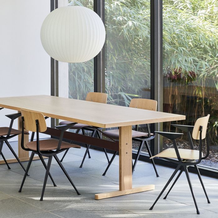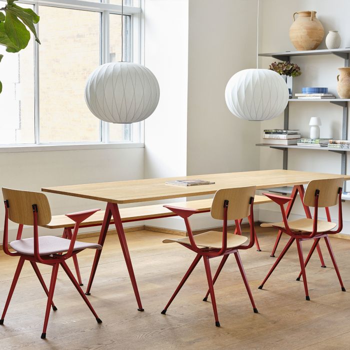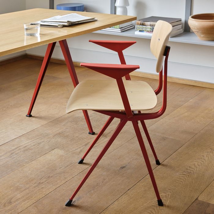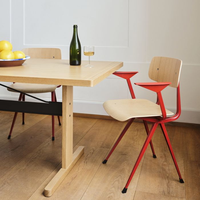 Result Armchair de Hay. Le fauteuil Result partage la même base en tôle d'acier mince, le siège et le dossier en chêne que le Result Chair original, mais est complété par des accoudoirs surélevés qui apportent un confort et une fonctionnalité supplémentaires au design. Créée à l'origine par Friso Kramer et Wim Rietveld alors qu'ils travaillaient chez Ahrend dans les années 1950, la collection en acier découpé a été relancée par HAY en collaboration avec Ahrend. Il est disponible dans une variété de finitions en bois et de couleurs de base, ainsi qu'une variante avec assise rembourrée et une version entièrement rembourrée proposée dans une large gamme d'options de textiles et de cuir. Toutes les variantes peuvent être coordonnées avec la Pyramid Table, ce qui en fait une configuration de sièges polyvalente pour une utilisation dans de nombreux contextes publics et privés.