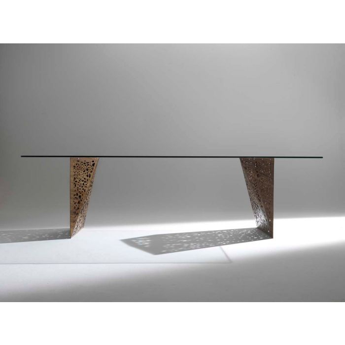 Riddled est une table créée par Steven Holl pour Horm. Cette table se suffit à elle-même par sa beauté naturelle. Les deux pieds apportent une touche somptueuse grâce à la chaleur du noyer. Pour sublimer le tout, les pieds sont découpés au laser. Pour une ambiance tendance, Riddled se pare d'un plateau de verre.