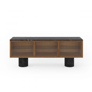 Matériaux : Noyer, marbre Marquina et Verre trempé ondulé