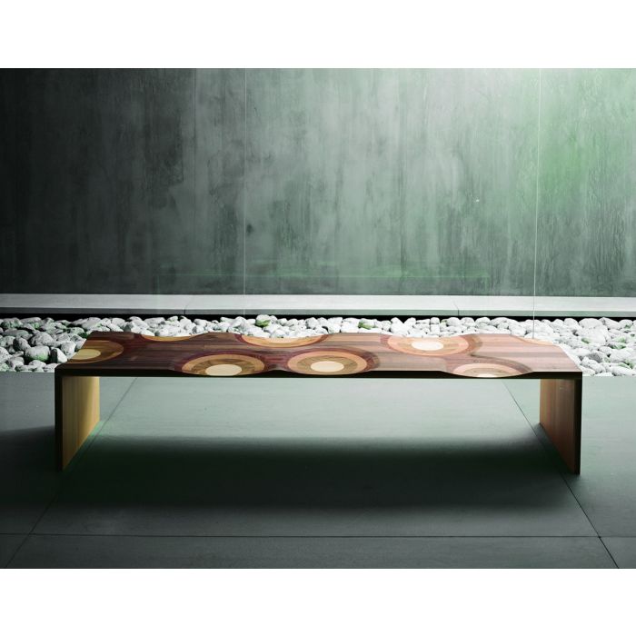 Le banc Ripples de Toyo Ito, vainqueur du Compasso dOro 2004, a donné naissance à une collection caractérisée par différents types de meubles. Composée de plusieurs couches de cinq bois massifs différents. Le noyer canaletto, lacajou, le cerisier, le chêne et le frêne se succèdent. Les couleurs et les sens des fibres sont définis afin de produire un élégant effet polychrome. Le travail du bois, unique et poétique, encadré dans un périmètre esthétique rigoureux, évoque un mouvement fluide, telle laction dun caillou jeté dans leau.