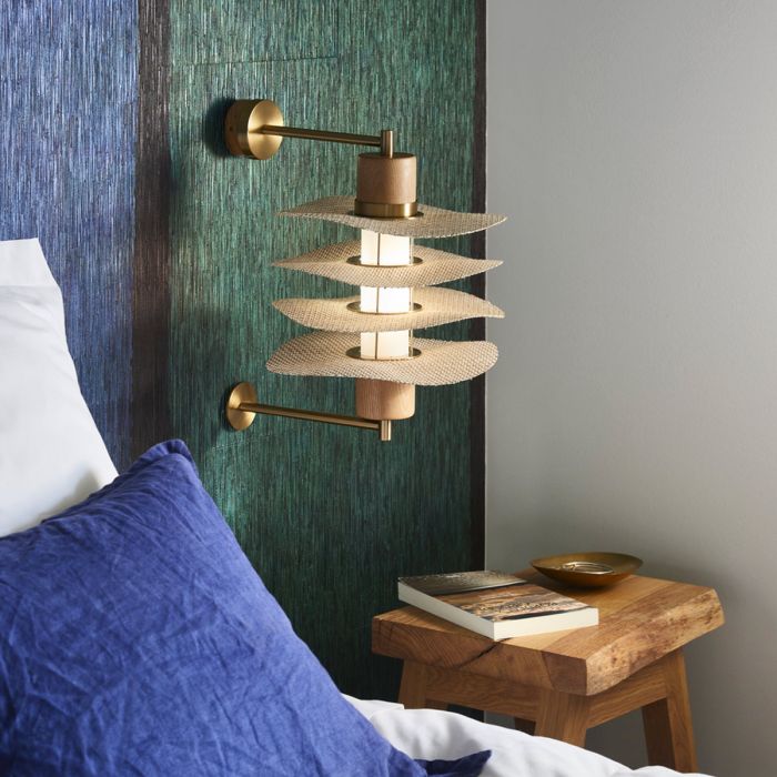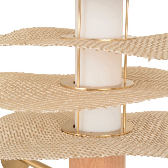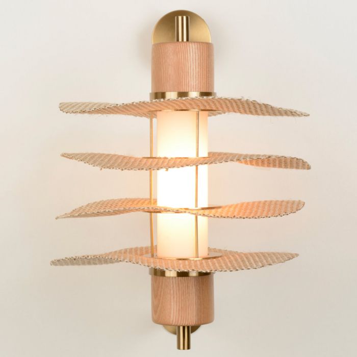 Applique 1 lumière. Superposition de 4 abat-jour en matière Varian®. Patère déportée en chêne clair et métal finition laiton brossé. Diffuseur tube en verre opale.