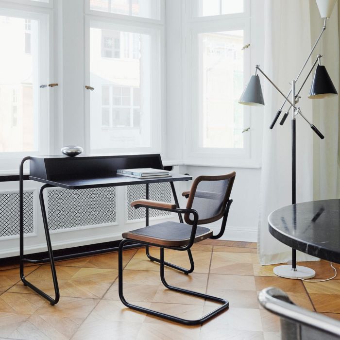 Pour cette conception, l'équipe de conception Thonet s'est inspirée de la collection de meubles en acier tubulaire classique de l'entreprise. L'avantage décisif du S 1200 réside dans ses dimensions compactes, qui lui permettent de s'intégrer même dans les plus petits espaces de vie. Un cadre en acier tubulaire bien conçu constitue la base du S 1200 ; sa conception inclinée permet de se tenir debout même dans les couloirs et les niches les plus étroits. Un repose-pieds assure une position assise confortable.