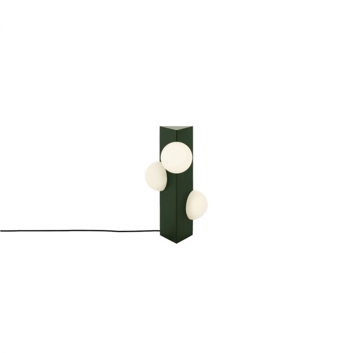 Sfera de Pulpo par Victoria Wilmotte. La lampe Sfera se distingue par son cadre triangulaire en acier, disponible en plusieurs finitions. Trois globes soufflés à la main diffusent une lumière vive et sculpturale, créant une ambiance austère et artistique, incarnant parfaitement l'univers archaïque et avant-gardiste de Victoria Wilmotte.