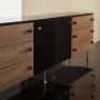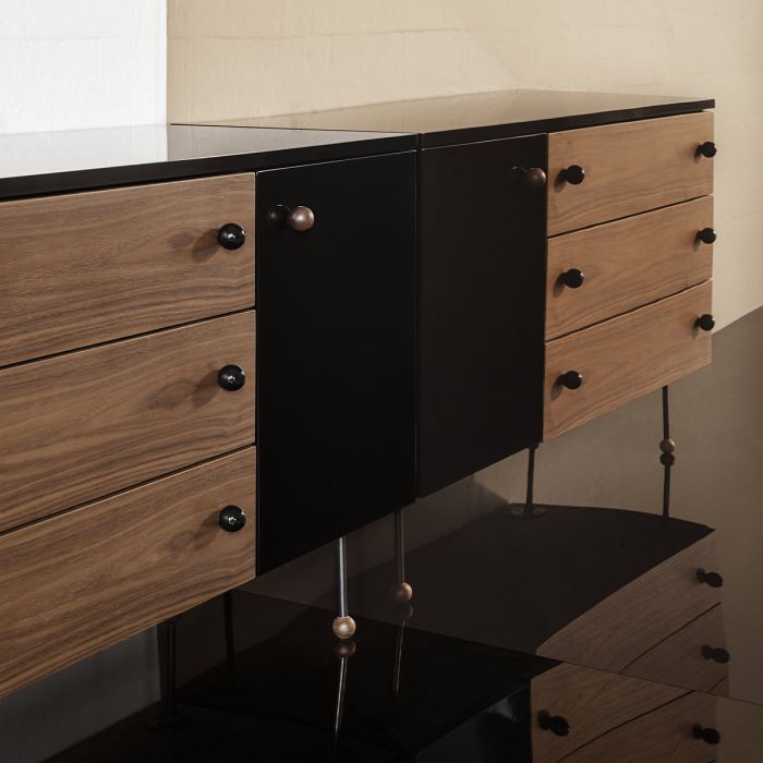 Conçu en 1952 par Greta M. Grossman, mais nommé le 62 Dresser car il était réputé avoir dix ans d'avance sur son temps. Le tiroir illustre le penchant du créateur pour les formes exceptionnelles et les associations de matières inhabituelles. Les pieds en métal élancés aux pieds en forme de boule, un trait caractéristique de Grossman, contrastent avec la forme rectangulaire tranchante du luxueux noyer américain, donnant au meuble une apparence caractéristique de légèreté et semblant presque défier la gravité. Ajoutant à son élégance, le tiroir est pourvu d'une finition noire profonde et brillante sur le dessus de la table et de petites sphères en bois massif.