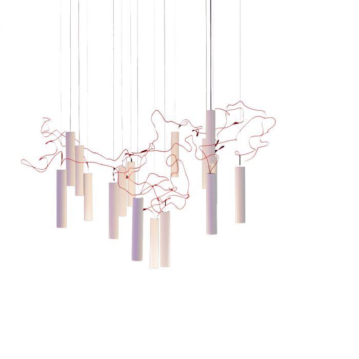 Simbiosi de Davide Groppi. Un petit tour de prestidigitation basé sur la possibilité de relier les diodes en série en utilisant des courants électriques très bas et, donc, des câbles presque invisibles. Le fil, extrêmement fin, qui unit les corps et les fait vivre l’un en fonction de l’autre, est la composante fondamentale du projet et représente la synthèse de notre poétique.