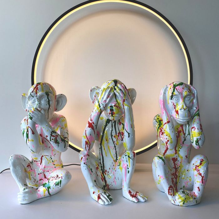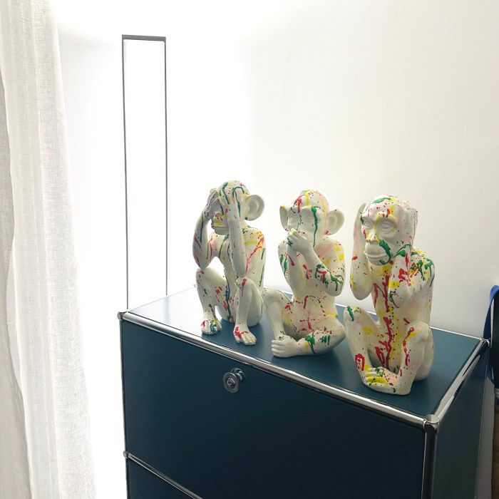 Le designer SJ réinvente ces symboles ancestraux en leur offrant des finitions contemporaines audacieuses. Proposées en résine laquée (noir ou blanc brillant) ou en finition or/chrome (comme illustré), ces sculptures transforment une figure philosophique en un objet de décoration Pop Art. Leur surface lisse et brillante capte la lumière, injectant une dose de luxe et de modernité dans votre intérieur. Ces singes Artypopart ne font pas que décorer ; ils harmonisent votre foyer, créant une ambiance calme et apaisée, tout en servant de rappel élégant d'une sagesse intemporelle.