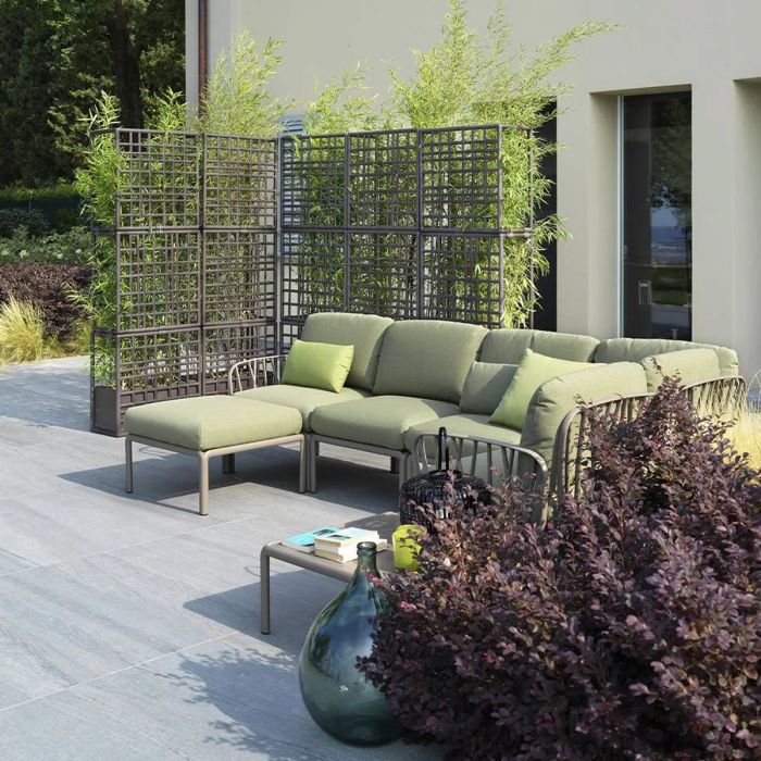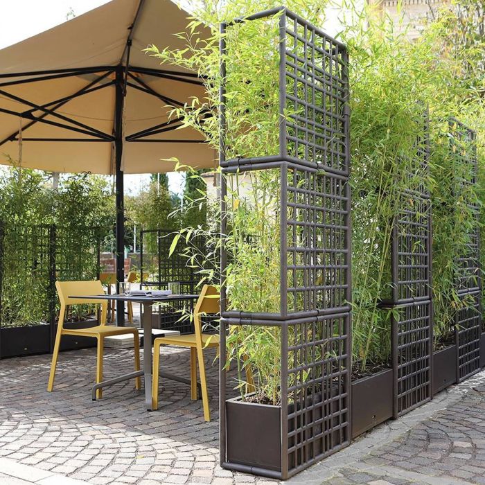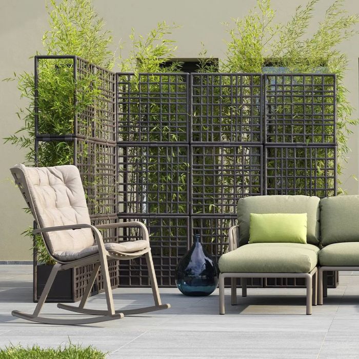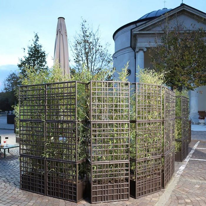 Sipario 3 de Nardi par Raffaello Galiotto. Sipario est un système modulaire de cloisons de séparation pour extérieur en plastique recyclé avec jardinière à auto-arrosage. Caractérisés par un dessin à maillage asymétrique, les modules permettent de créer des configurations linéaires, brisées (en zigzag) et courbes. Cloison extérieure modulaire autoportante pouvant être configurée comme bon vous semble et parfaite pour diviser les espaces en extérieur. Composée de 3 éléments grillagés pouvant facilement s’accrocher sans l’utilisation de vis et d’un pot de fleurs à auto-arrosage. Les modules peuvent être empilés au hauteur maximum de 3 éléments. Pour assurer la stabilité du produit, le vase doit être rempli avec au moins 30 kg de lest.
