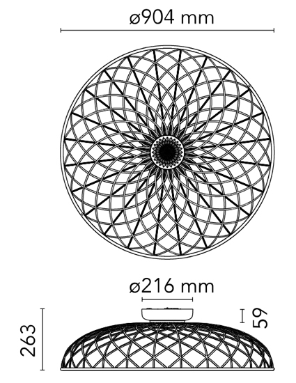 Plafonnier Skynest à éclairage diffus. Le dôme est une combinaison d'éléments lumineux et sombres disposés en réseau et formé de structures centrales recouvertes d'une fine maille tubulaire colorée entrelacée en tissu recyclé et recyclable produit à partir de polyester. Chaque élément lumineux est alimenté par des micro-connecteurs spéciaux situés au sommet du dôme et est recouvert d'un maillage bicolore, tandis que le côté faisant face à l'intérieur du dôme est toujours blanc afin de permettre une émission lumineuse optimale du Module LED. L'appareil est équipé d'un système d'équilibrage intégré au sommet du dôme qui permet d'ajuster son équilibre, le rendant parfaitement stable. Le bas du dôme est complété par un anneau en aluminium qui maintient toute la structure du réseau des dômes en place grâce à un simple système d'encliquetage. Le produit est assemblé sans aucune colle, il peut donc être entièrement séparé pour être recyclé à l'avenir et en cas de réparation ou de remplacement. Finitions de lampe disponibles : Bleu Tourmaline, Amande, Anthracite ou Rouge Brique. Équipé d'une électronique intégrée qui permet l'utilisation de différents systèmes de gradation : 0-10V / 1-10V / DALI / PUSH."