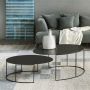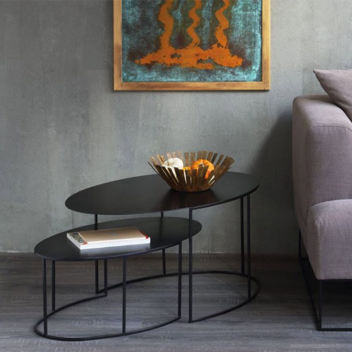 Tables basses superposables en deux dimensions. Profilés en acier carré plein 8 x 8 mm et plateau en tôle d’acier épaisseur 2 mm, peinture époxy noir cuivré sablé.