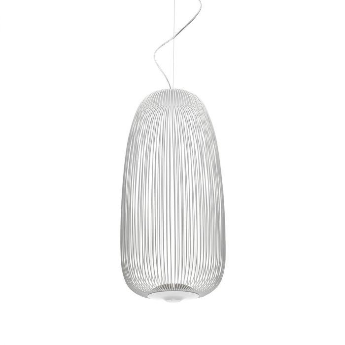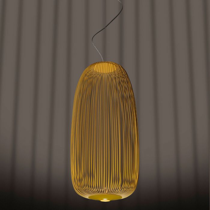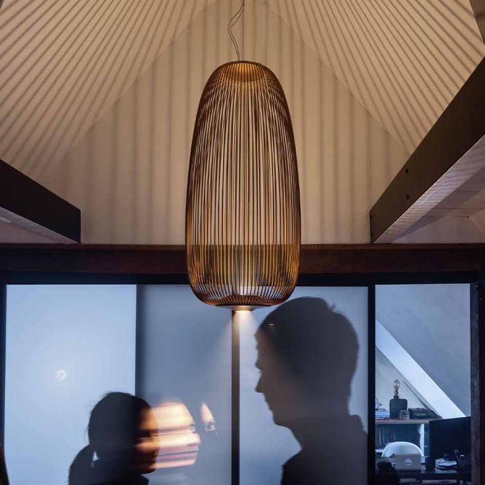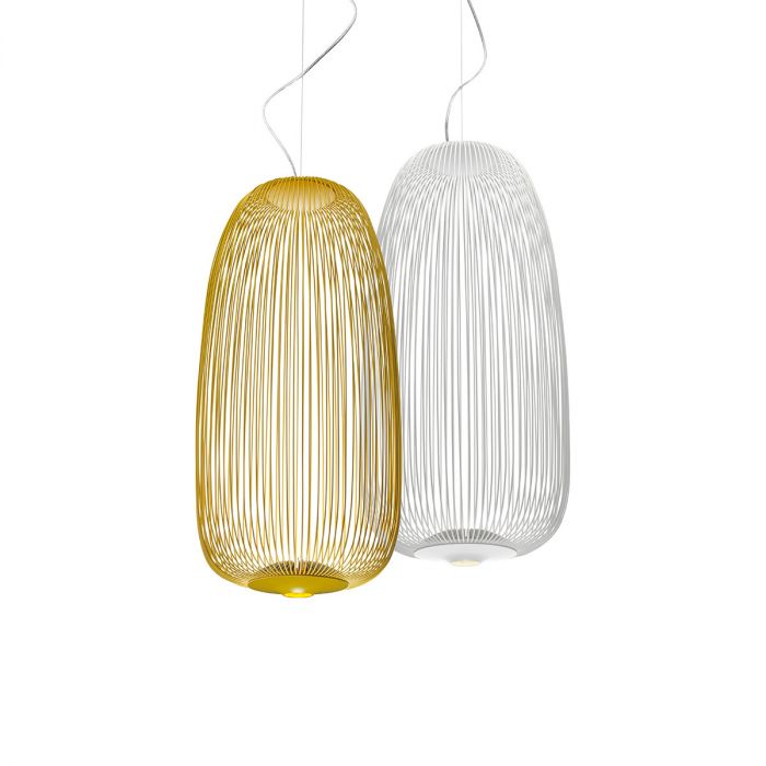 La lampe a suspension Spokes puise son inspiration des anciennes lampes orientales à volières domestiques. La réalisation naît de l’observation des rayons d'une roue de vélo, d'où le nom du projet, Spokes, qui signifie « rayons » en anglais. Résultat : une lampe aux formes rondes et au volume léger qui contient la lumière, tout en la laissant filtrer dans l'espace. La légèreté qui caractérise le projet s'associe à la solidité de la forme, réalisée en fil de métal, et à la fonctionnalité de la source lumineuse à LED, qui permet à la fois d'éclairer par le dessous à la perfection, et d'obtenir des jeux d'ombres et lumières qui se projettent sur les parois avec un effet magique de démultiplication. La suspension Spokes est adaptée aussi bien aux espaces domestiques que publics, et notamment pour personnaliser les grands volumes, grâce à la possibilité de réaliser des compositions multiples.