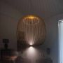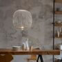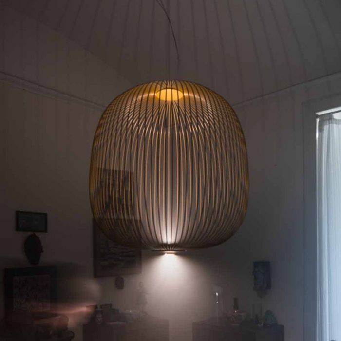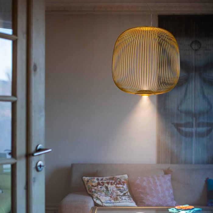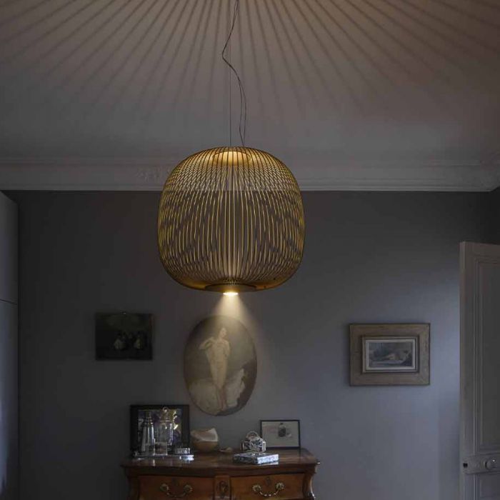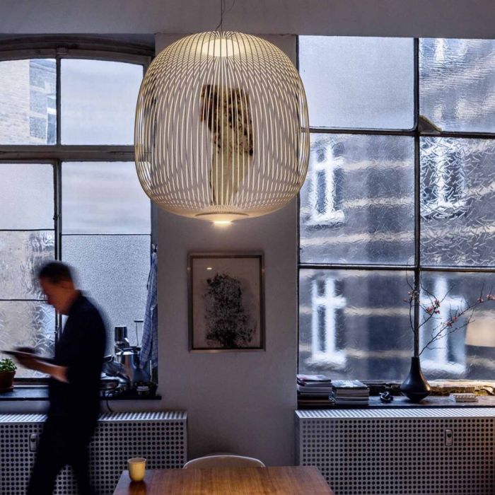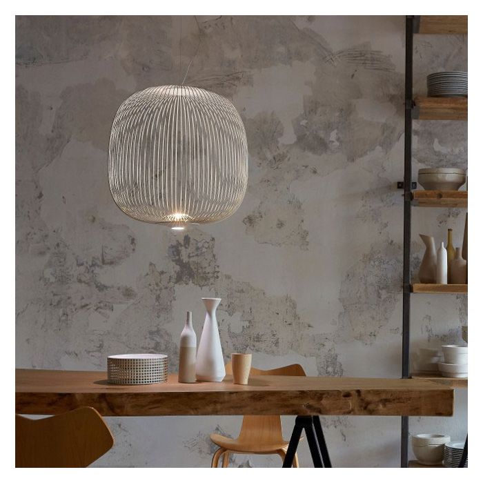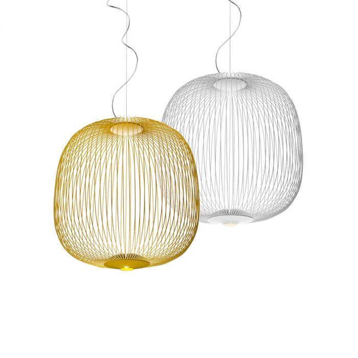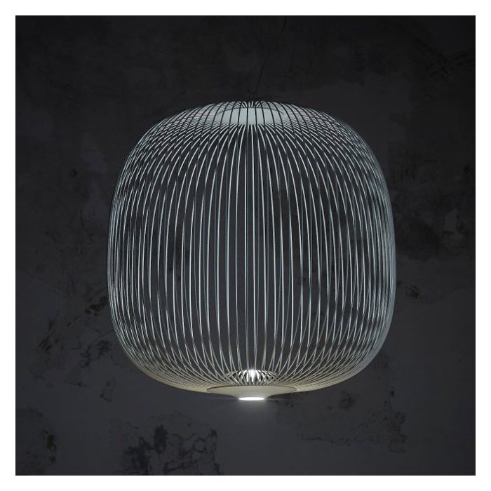 La lampe a suspension Spokes puise son inspiration des anciennes lampes orientales à volières domestiques. La réalisation naît de l’observation des rayons d'une roue de vélo, d'où le nom du projet, Spokes, qui signifie « rayons » en anglais. Résultat : une lampe aux formes rondes et au volume léger qui contient la lumière, tout en la laissant filtrer dans l'espace. La légèreté qui caractérise le projet s'associe à la solidité de la forme, réalisée en fil de métal, et à la fonctionnalité de la source lumineuse à LED, qui permet à la fois d'éclairer par le dessous à la perfection, et d'obtenir des jeux d'ombres et lumières qui se projettent sur les parois avec un effet magique de démultiplication. La suspension Spokes est adaptée aussi bien aux espaces domestiques que publics, et notamment pour personnaliser les grands volumes, grâce à la possibilité de réaliser des compositions multiples.