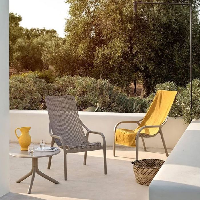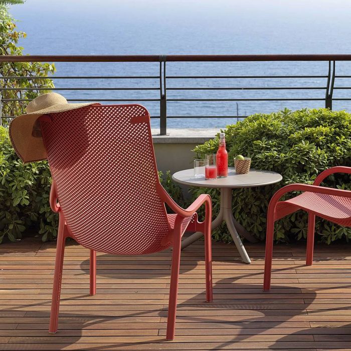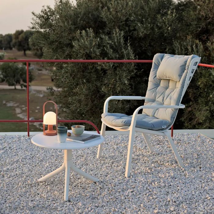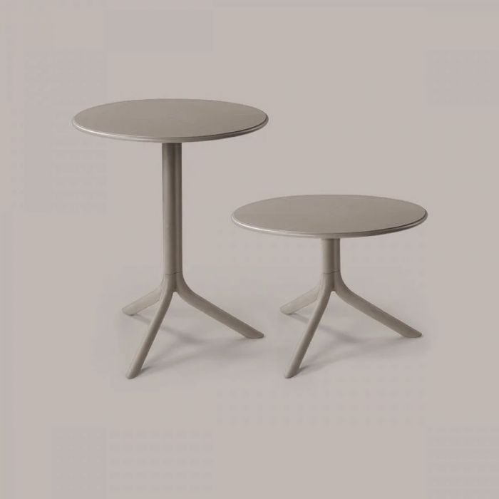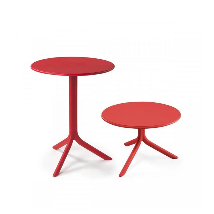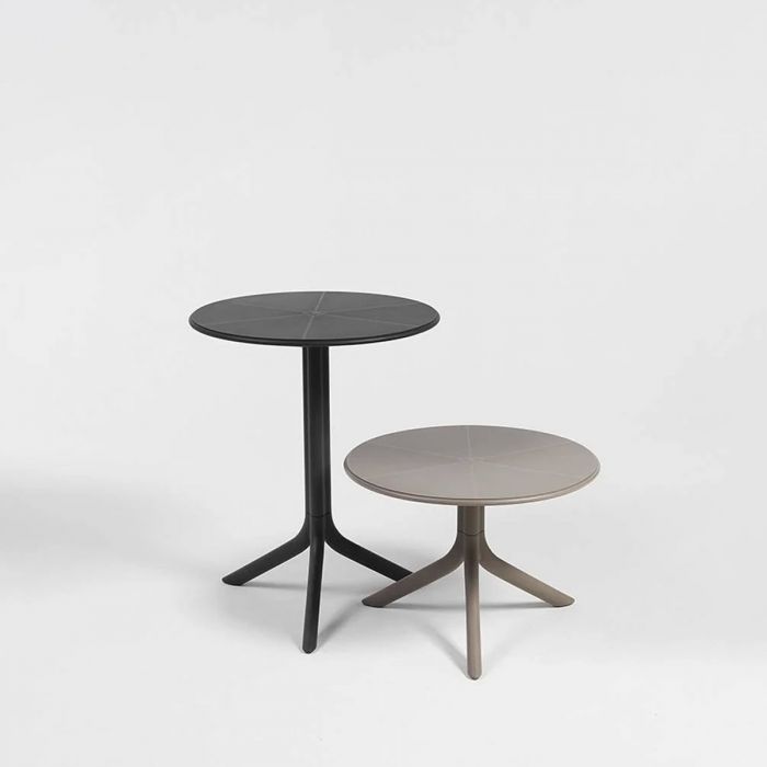 Spritz de Nardi par Raffaello Galiotto. Petite table mange-debout, en résine fibre de verre à plan rond et base à trois pieds prévue pour l’extérieur, parfaite aussi comme complément au mobilier d’intérieur. Facile à monter et à démonter, elle est proposée avec un kit permettant d’obtenir deux hauteurs.