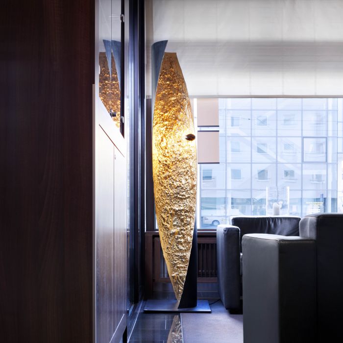 Stchu-Moon sépare la source lumineuse de l’objet éclairant, qui acquiert ainsi une valeur esthétique indépendante. La réfraction de la lumière se confronte ici à des surfaces délibérément irrégulières, qui multiplient la quantité de lumière et rendent l’objet lui-même entièrement lumineux.