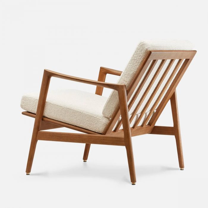 Stefan Lounge chair de 366 Concept. Après 60 ans, le fauteuil Stefan est réédité, alliant élégance intemporelle et confort supérieur. Son profil d'accoudoir organique et son dossier ajouré lui confèrent un caractère léger et mid-century, tandis que deux coussins indépendants le rendent confortable et pratique. Le fauteuil est fabriqué avec soin et savoir-faire à partir de bois de chêne.