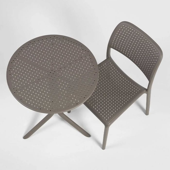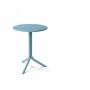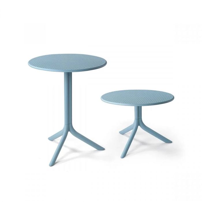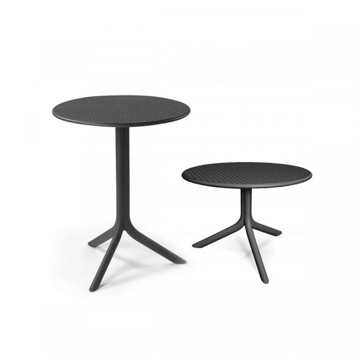Step de Nardi par Raffaello Galiotto. Petite table mange-debout en résine fibre de verre dotée d’un plan plié à section creuse rond se distinguant par de petits orifices décoratifs et fonctionnels et donc dotée d’un très bon pouvoir drainant. La base à trois pieds, facile à monter et à démonter, est proposée avec un kit permettant d’obtenir deux hauteurs.
