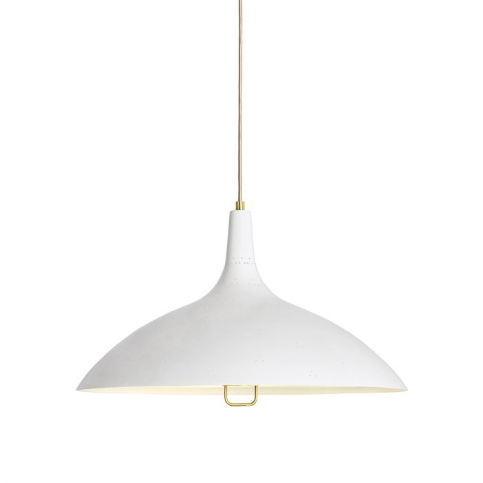 Le pendentif de 1965 a été conçu à l'origine par Paavo Tynell en 1947. Comme beaucoup de ses créations les plus connues, le pendentif a été conçu pour la Finland House à New York - l'un des projets les plus ambitieux et les plus réussis de tous les temps pour présenter le design finlandais. Perfectionnant les techniques de finition des métaux, Tynell a développé le pendentif 1965 avec son exceptionnelle capacité à capturer et à traduire une grâce et une légèreté exubérantes dans ses créations en laiton. Caractérisé par son motif de perforation triangulaire, détail artistique utilisé par Tynell dans plusieurs de ses objets d'éclairage, le pendentif de 1965 reflète le savoir-faire distingué du designer finlandais. Avec un diffuseur en verre dépoli qui adoucit la lumière, le pendentif contribue à un environnement subtil et tranquille.