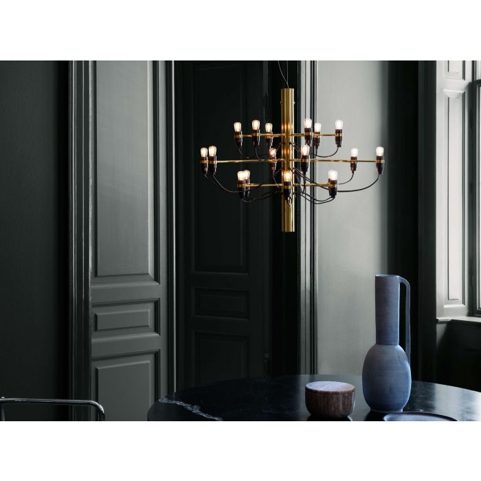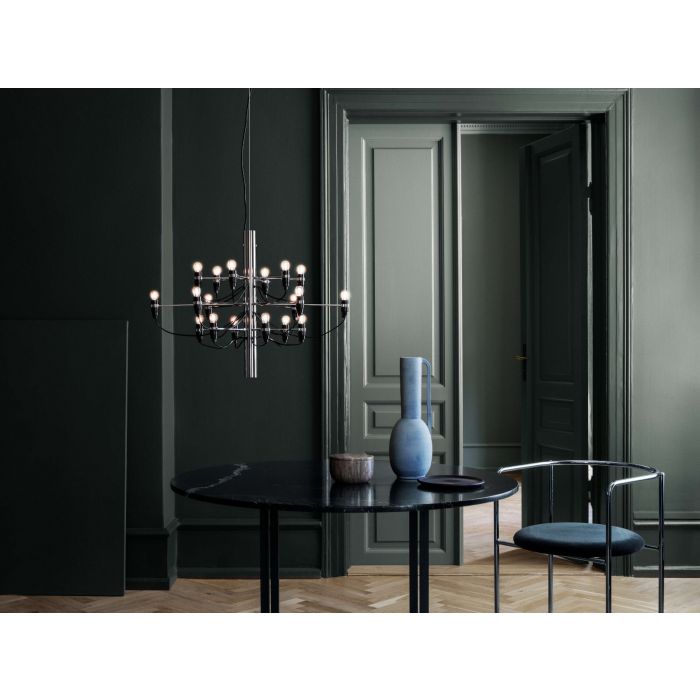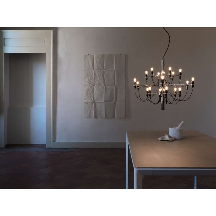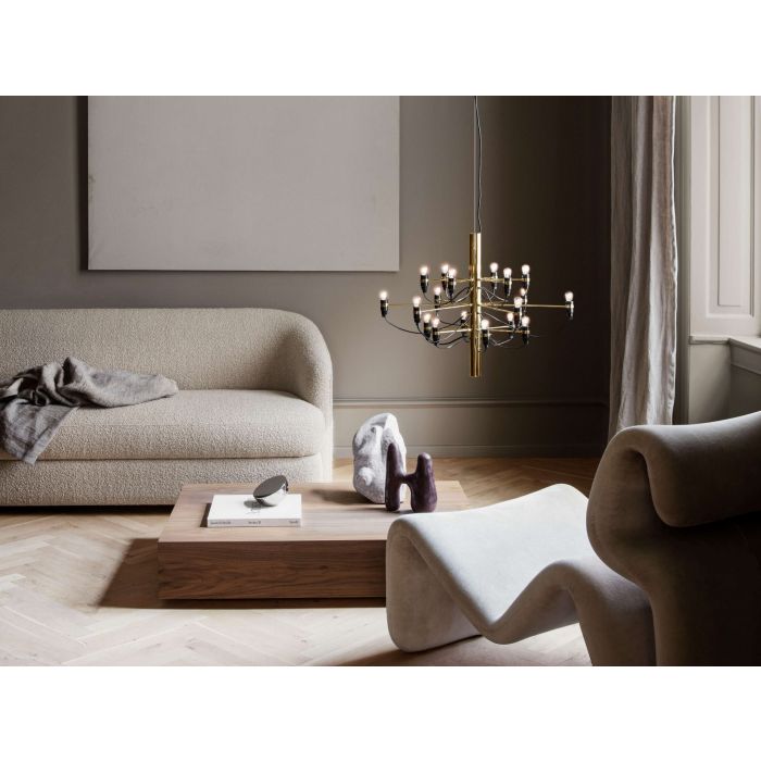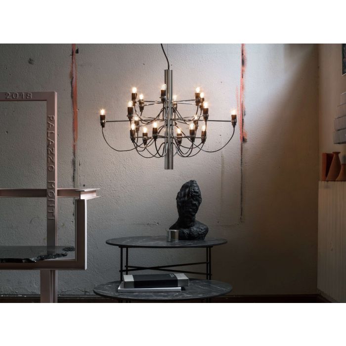 En revisitant l’esthétique classique d’un chandelier, Gino Sarfatti dessine 2097 en 1958. Les ampoules et les câble sont exposé, ce qui donne une forme moderne et minimaliste. La collection de lustres mordernes est enrichie par le tout nouveau modèle 2097/18, hébergeant 18 ampoules LED disponibles en version claires ou givrées, avec deux températures de couleur différentes. Même design et allure, dans une version plus discrète.