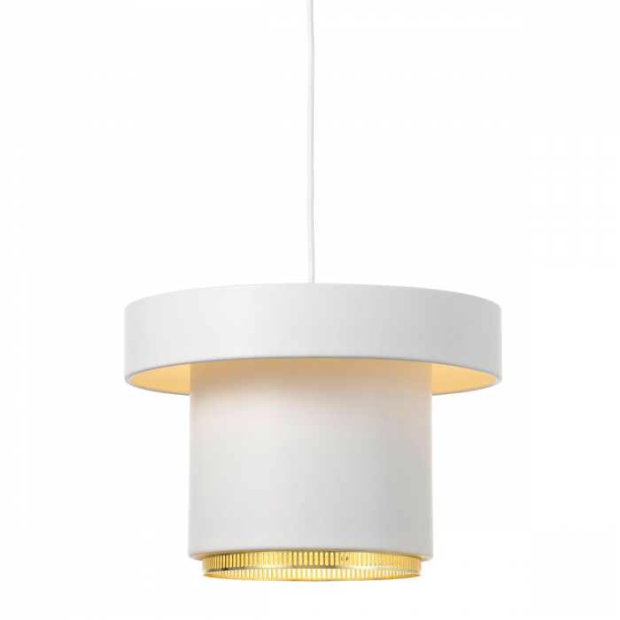 La suspension lumineuse A201 a été conçue par Alvar Aalto en 1952 pour la bibliothèque de l'hôtel de ville de Säynätsalo en Finlande centrale. Composée de tôle d'acier formée, la suspension lumineuse A201 possède une présence sculpturale ; sa beauté peut être appréciée qu'elle soit allumée ou éteinte. La lumière sortant de la partie inférieure et supérieure de l'abat-jour crée un magnifique halo, typique d'Aalto qui cherchait à rendre la lumière artificielle aussi indirecte et douce que possible. L'A201 est disponible en blanc standard avec des détails en laiton, inspirée de la triple variation de la lumière (A203) suspendue au-dessus de la table à manger dans la maison privée d'Helsinki des Aaltos.