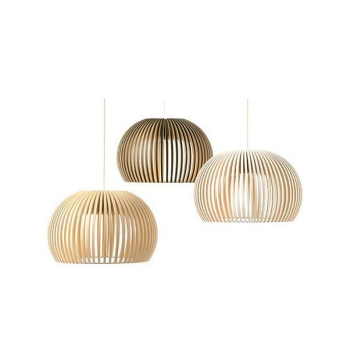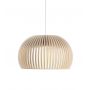 La suspension Atto, avec ses lignes toutes en rondeur, est entièrement fabriquée à la main par des artisans hautement qualifiés et certifiés de Finlande. Les lattes des abat-jours sont reliées par des anneaux réalisés en "aircraft plywood", matériau utilisé en aéronautique car hautement résistant à la chaleur. Cette suspension dispose d'un câble électrique de 1.8 m de longueur. Secto Design a une démarche citoyenne sur la réduction de son empreinte écologique en s'approvisionnant localement en bois et en recyclant ses déchets comme bois de chauffage, en jouets pour les crèches ou pour les écoles de menuiserie. Avec son style design et sa forme très arrondie, cette suspension met en avant un esthétique authentique et dégage une lumière douce. Très raffinée, elle devient un véritable élément de décoration grâce à son look tendance.