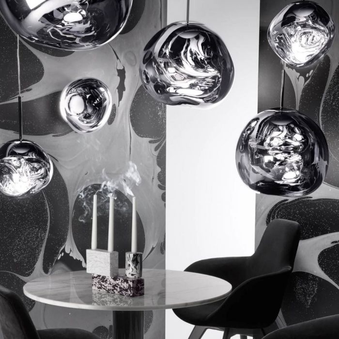 Avec cette superbe suspension, vous aurez des reflets infinis, des jeux sur l'espace et des arrangements visuels avec l'aspect extraordinaire de cette gamme de produit. Chacun d’entre eux est unique et facile à installer grâce à un baldaquin de plafond rond. La série Melt, est une série déformées de finition translucide en cuivre, or, et chrome qui sont transparentes et fluides lorsqu'elles sont chauffées.