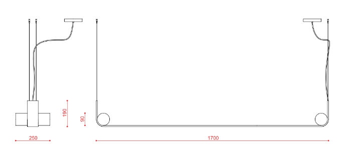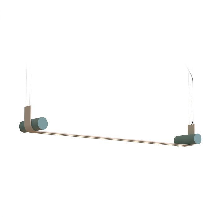 La suspension est recouverte d'une poudre époxy structure en bande d'aluminium accompagnée d'un poids cylindrique qui contrebalance sa flexuosité, dans un équilibre visuel raffiné. La source de lumière se compose d'une bande LED à intensité variable ; les cylindres sont disponible en métal enduit de poudre époxy, en bois et en brossé laiton.