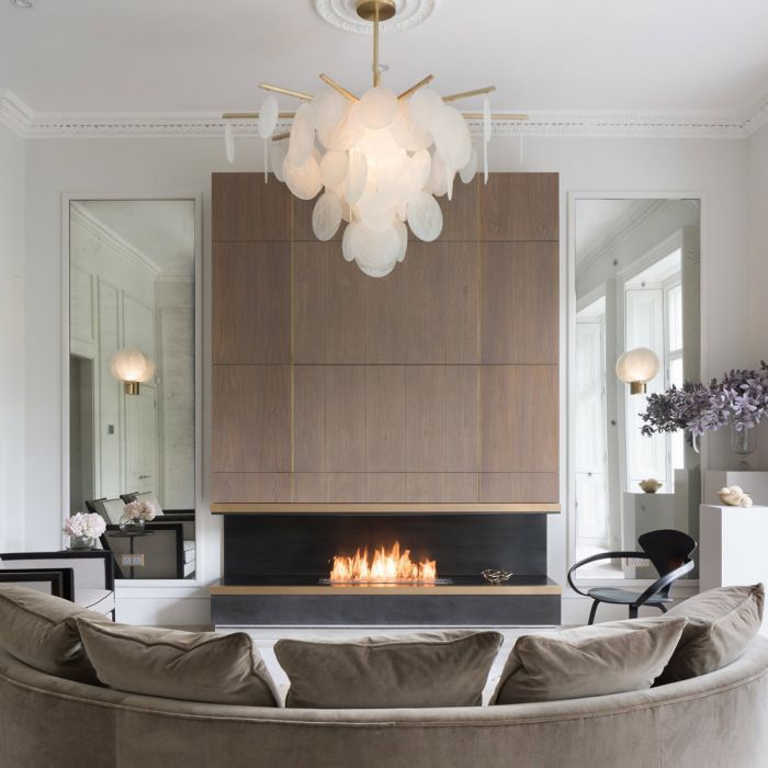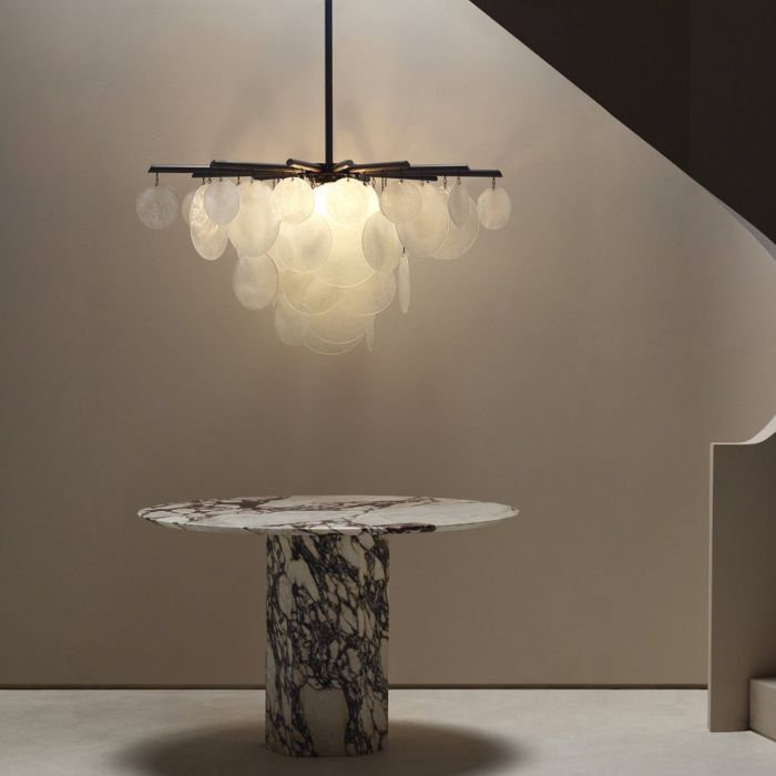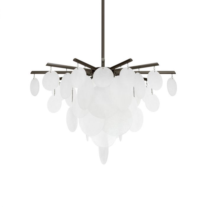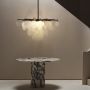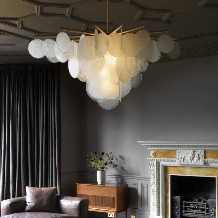 Chaque morceau de verre est unique. Les gouttelettes sont formées à la main par nos artisans en utilisant un processus où se forment des ondulations et des textures cristallines. Le verre translucide est complété et magnifiquement encadré par la ferronnerie symétrique. La lumière émise est une lueur chaude et douce. Faisant référence à l'esthétique rétro et moderne, le Nimbus crée une pièce maîtresse époustouflante et transforme ceux qui le voient.