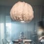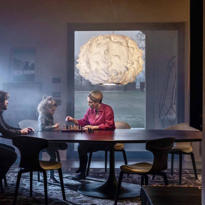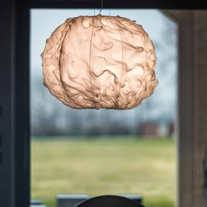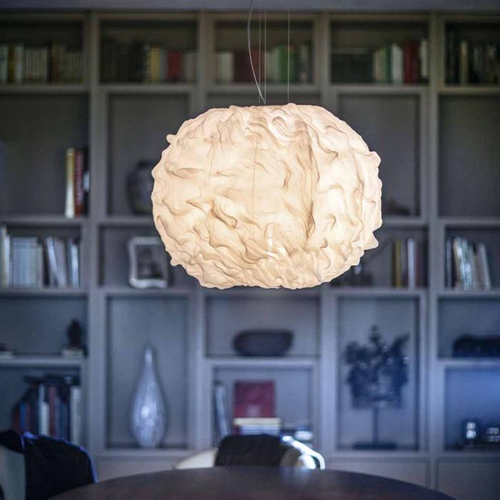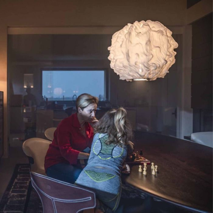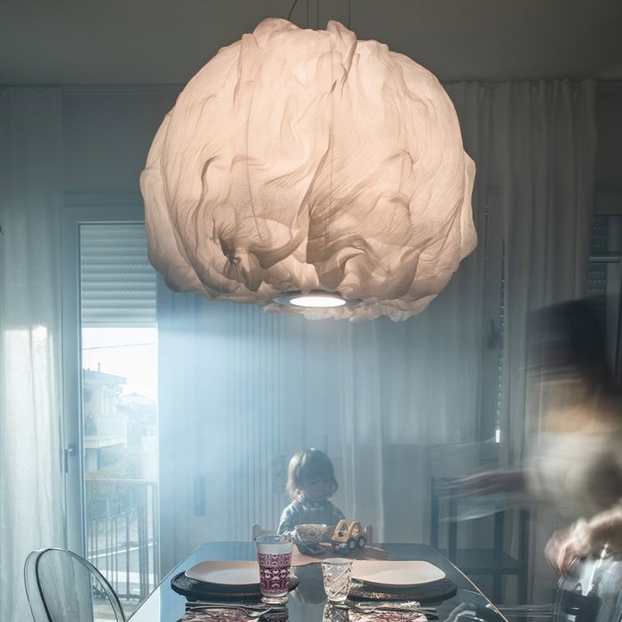 Comme une multitude d'êtres ou de choses regroupées d'une manière apparemment guidée, mais en réalité aléatoire, Nuée génère un contraste entre spontanéité et coordination dans une lampe dont la physionomie ne peut être appréhendée, mais simplement contemplée. Nuée est une lampe de présence théâtrale réalisée en superposant un tissu technique tridimensionnel, que la lumière traverse de manière irrégulière et évocatrice. Le fil continu du tissage permet des déformations qui deviennent poétiques: des zones sombres apparaissent sur une base blanche, comme un nuage qui assombrit sa couleur dans les zones plus compactes.