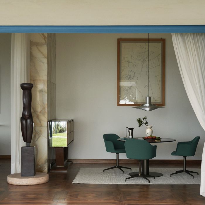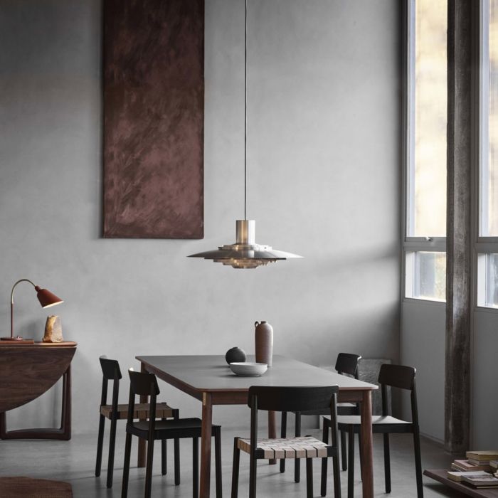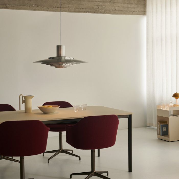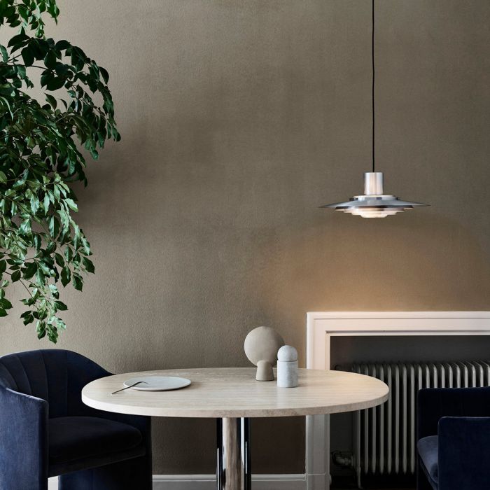 La suspension P376 est un parfait exemple de la subtile conception architecturale de Kastholm & Fabricius. Conçu à l'origine en 1963, cinq abat-jour concentriques créent des dégradés de courbes vers le milieu de la lampe pour émettre une lumière douce et diffuse. Le placement discret des abat-jour et la finition en aluminium soyeux aboutissent à une expression cohérente à la fois emblématique et captivante.