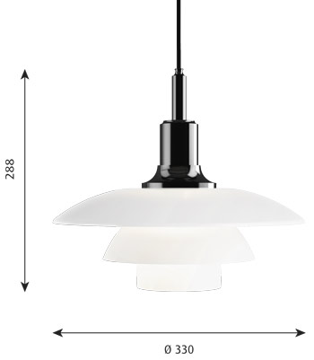La lampe PH 3 ½-3 Verre Suspension constitue l’un des nombreux projets entrepris par Poul Henningsen dans le cadre du développement de son ensemble abat-jour, un concept jouissant d’une réputation mondiale lancé en 1926. Poul Henningsen a consacré la majeure partie de sa vie à dompter l’éclairage électrique. Il a basé son concept d’ensemble abat-jour sur une spirale logarithmique pour exploiter la source lumineuse de manière optimale. Il réalisait des calculs et des essais en permanence. La forme des abat-jour découle de la manière dont ils devaient façonner et réfléchir la lumière, et la lampe a été conçue pour être anti-éblouissante. Les abat-jours de verre opalisé blanc adoucissent l’aspect général de la lampe et illuminent son environnement avec une lumière parfaite, harmonieuse et anti-éblouissante que seul l’ensemble abat-jour classique peut produire. Les abat-jours sont composés de trois couches de verre opalisé soufflé, poli à l’extérieur et sablé à l’intérieur, de façon à permettre une répartition de la lumière qui soit à la fois douce et homogène.