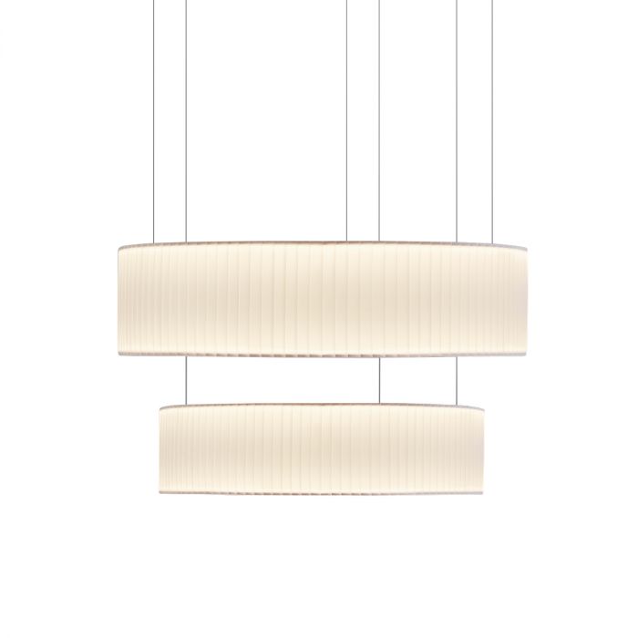 Composition de 2 RONDE : suspensions en ruban de tissu blanc, acier laqué blanc, variable. Éclairage LED intégré, variable TRIAC. Diamètres 60cm et 80cm.