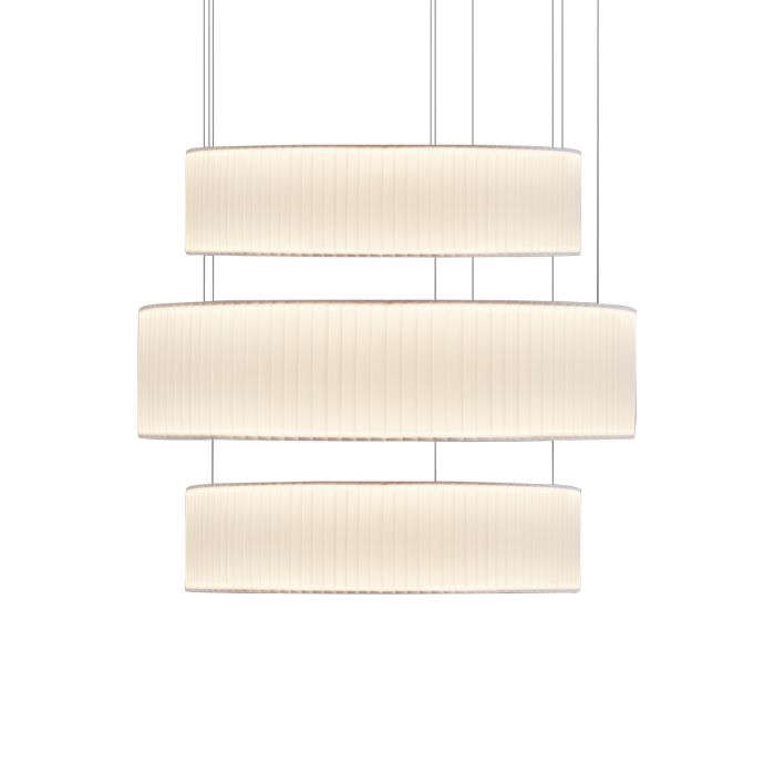 Composition de 3 RONDE : suspensions en ruban de tissu blanc, acier laqué blanc, variable. Éclairage LED intégré, variable TRIAC. Diamètres 60cm / 80cm / 60cm.
