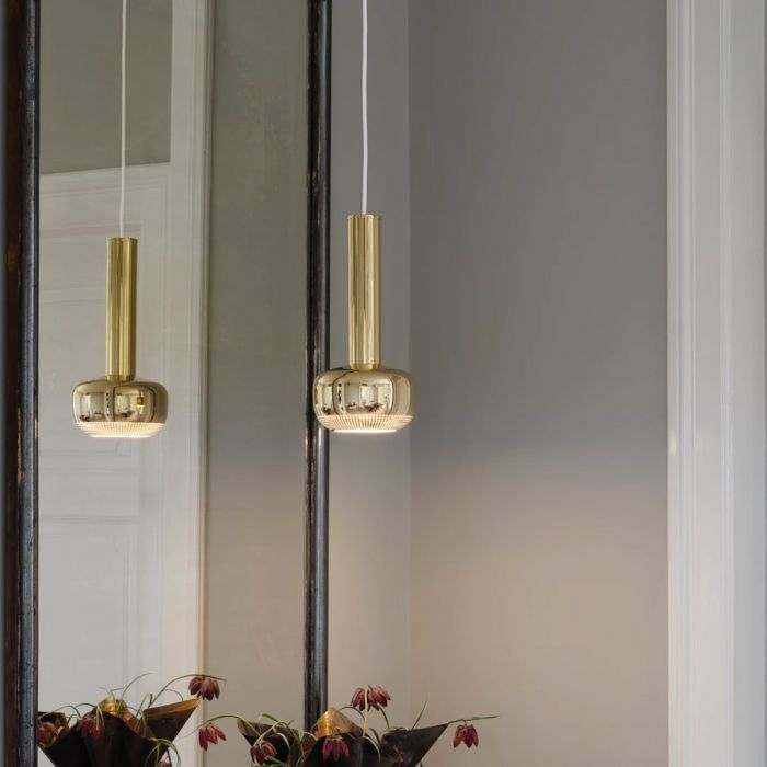 Vilhelm Lauritzen, l’architecte fonctionnaliste renommé, a conçu la suspension VL 56 pour Folkets Hus, à Vesterbro Copenhagen. Conçu et construit à l’origine pour un syndicat danois, le bâtiment a ouvert en 1956 et il est désormais utilisé en tant que salle de concert nommée Vega. Le bâtiment est un « gesamtkunstwerk », ce qui signifie que Lauritzen a tout conçu dans le bâtiment, depuis les boutons de porte, les escaliers et les prises électriques en passant par les meubles et les lampes. La suspension VL 56 est l’une des lampes Vilhelm Lauritzen conçues pour Vega et, à ce jour, elle est suspendue au-dessus du bar à panneaux en bois, à côté de la salle de concert. Les versions chrome et laiton ont été réintroduites en 2023, avec de légers ajustements et améliorations.