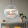 Le pendentif décoratif VP Globe présente une sphère extérieure en acrylique transparent cristallin avec cinq réflecteurs internes suspendus par trois chaînes en acier. Des touches de rouge et de bleu ajoutent la touche finale au design sculptural futuriste et mettent en valeur l'ADN indubitable du design Panton. Avec le VP Globe, l'ambition de Panton était de concevoir une lampe qui pourrait attirer l'attention et unir une pièce, qu'elle soit suspendue seule ou en grappes. Cela fait de la suspension un choix idéal au-dessus d'une table de salle à manger, dans un couloir ou un long couloir, ou comme élément sculptural dans un coin. Le VP Globe est doté de réflecteurs en aluminium.