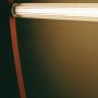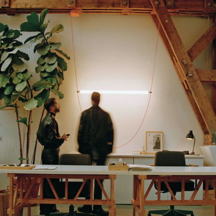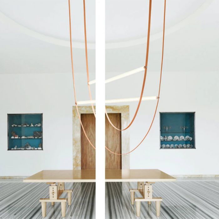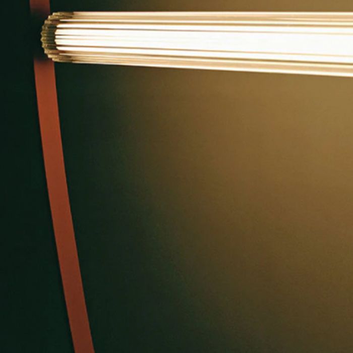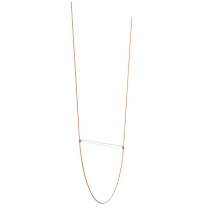 Suspension à lumière diffuse. Tube en verre extrudé transparent et diffuseur intérieur en PC opale. Écrous en acier inoxydable satiné fabriqués avec la technologie CNC. Câble en caoutchouc extrudé rose et vert forêt. Rosette en PC moulé par injection dans les mêmes finitions que le câble.