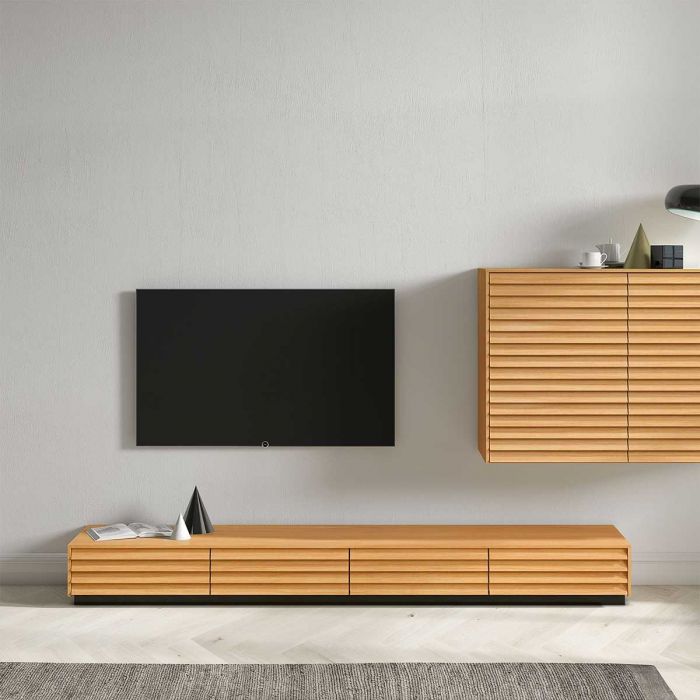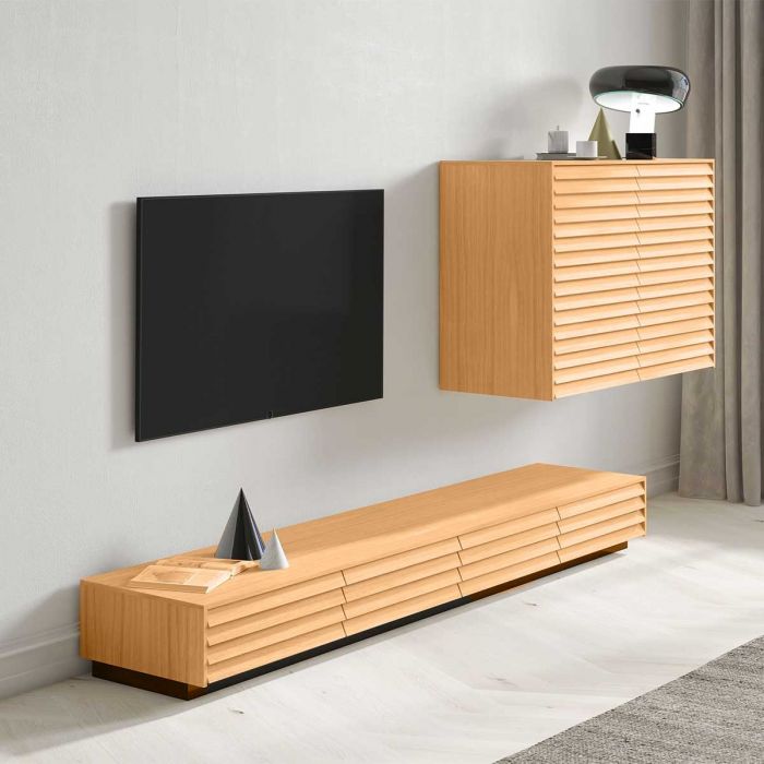 Buffet au design exclusif sur la face avant composée de barres horizontales qui cachent la composition et servent de poignées pour les portes et les tiroirs. Un meuble reposant sur un socle, les éléments de porte comprennent une tablette réglable en hauteur, plusieurs modèles sont disponibles.