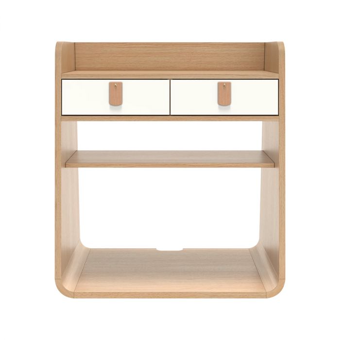 Ravissant chevet mural pour votre chambre ou délicat meuble d’appoint pour votre entrée, Suzon sait se faire caméléon. La douce Suzon saura prendre place en toute élégance dans de nombreuses pièces de votre maison. Avec ses lignes toute en douceur, Suzon possède ce talent fou de vous délester de vos objets du quotidien pour mieux en prendre soin. Merveilleux écrin, elle accueille vos clés ou petits accessoires dans ses tiroirs et expose vos bibelots d’art ou lectures du soir sur ses tablettes. Fabriquée au Portugal, Suzon sait concilier la chaleur du bois avec la gaieté de couleurs sobre et précieuse, un savant équilibre parfaitement maîtrisé. Sa structure en chêne massif s’incline et se décline avec deux tiroirs peints en laqué blanc ou couleur laiton brossé. Et deux poignées en cuir viennent parfaire son élégance… Suzon est une création de la designer française Florence Watine pour Hartô.