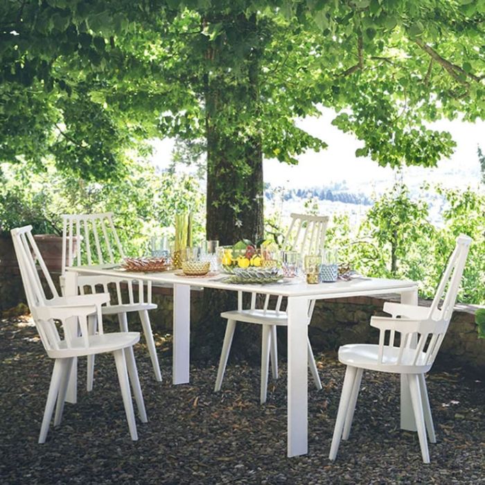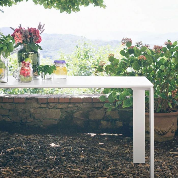 Four Outdoor est une table fonctionnelle et raffinée au design rigoureux et géométrique, l'alliée des journées passées en plein air grâce à ses finitions conçues spécialement pour un usage en extérieur.