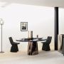 Les formes ovales de la base et du plateau de la table contrastent avec les facettes de la base, ce qui crée un jeu fascinant avec les réfractions et les reflets de couleur dans la pièce.