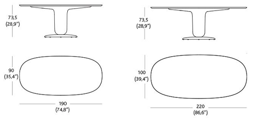 Matériaux : structure intérieur en acier peint, pied central et base en fibre de verre avec finition brillant (gel renforcé pour la durabilité), plateau en MDF laqué finition Fenix mat ou en plateau en verre trempé