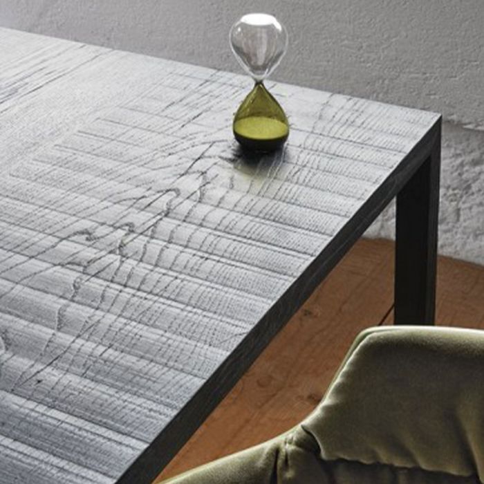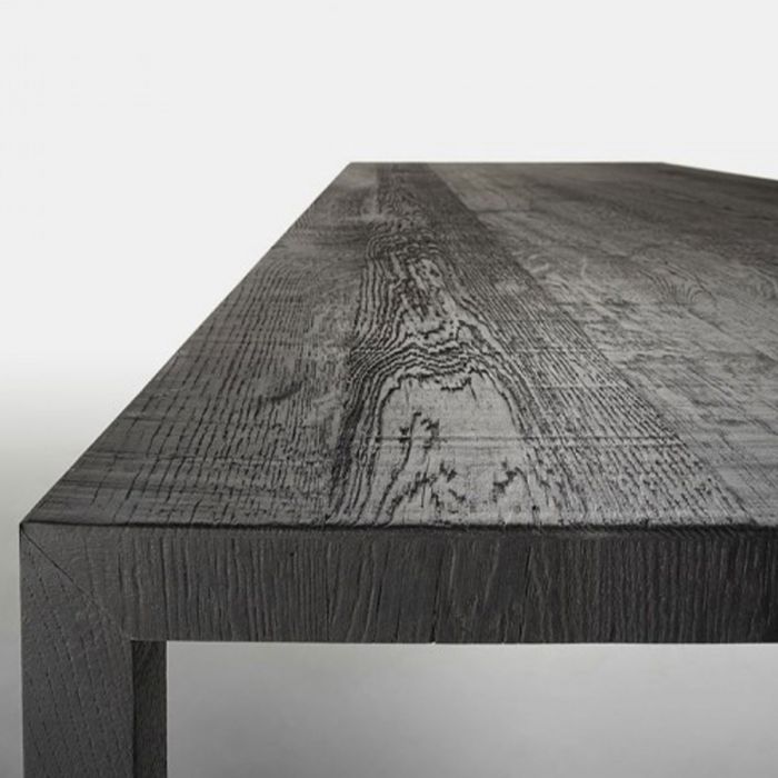 Le CHÊNE NATUREL met en valeur les veines du bois et dévoile le temps qui passe, rehaussant sa beauté. La surface naturelle et ridée n'est pas seulement une expérience visuelle, mais aussi tactile. Chaque table est différente d'une autre, donc chaque produit prend une personnalité unique. La finition de ce matériau tendu apporte de la chaleur dans le salon et s'intègre dans tous les contextes et styles d'ameublement. Inspiré de la technique japonaise, Tense CARBON part d'une base en chêne. En utilisant des acides naturels, on obtient un effet «brûlé» sur la surface. Ainsi, le bois semble noir avec des nuances intenses et entièrement naturelles, uniques et non reproductibles.