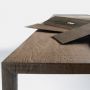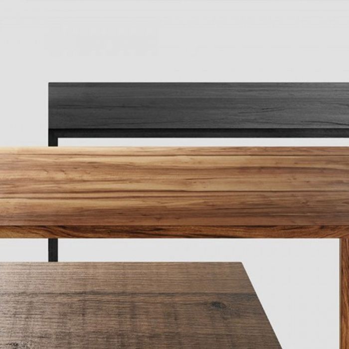 Le CHÊNE NATUREL met en valeur les veines du bois et dévoile le temps qui passe, rehaussant sa beauté. La surface naturelle et ridée n'est pas seulement une expérience visuelle, mais aussi tactile. Chaque table est différente d'une autre, donc chaque produit prend une personnalité unique. La finition de ce matériau tendu apporte de la chaleur dans le salon et s'intègre dans tous les contextes et styles d'ameublement. Inspiré de la technique japonaise, Tense CARBON part d'une base en chêne. En utilisant des acides naturels, on obtient un effet «brûlé» sur la surface. Ainsi, le bois semble noir avec des nuances intenses et entièrement naturelles, uniques et non reproductibles.