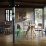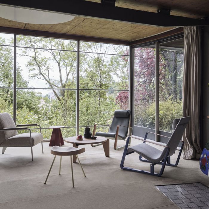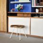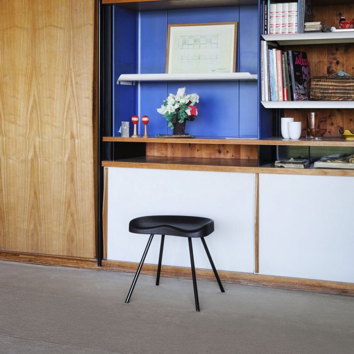 Au début des année 1950, Jena Prouvé a conçu plusieurs tabourets qu’il a nommé en leur attribuant différents numéros. L’assise du Tabouret N°307 à la forme d’une selle de tracteur - dépourvue de trous - et rappelle les sièges de l’amphithéâtre d’Aix-Marseille Université que Prouvé à conçu à la même époque. Initialement réalisée en tôle d’aluminium emboutie, l’assise ergonomique du Tabouret N°307 est fabriquée en chêne massif dans le version produit par Vitra. L’interaction entre l’assise en vois massif et les gracieux pieds en tube d’acier crée un contraste fascinant.