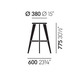 Pour créer le Tabouret Haut, Prouvé s’inspira de la typologie traditionnelle qui est encore utilisée aujourd’hui pour les tabourets de bar. Quatre pieds légèrement inclinés supportent un plateau d’assise rond. Un anneau, qui relie les pieds à environ un tiers de leur hauteur totale, renforce la construction et sert en même temps de repose-pieds. L’interprétation de Prouvé de cet archétype classique convainc par son allure simple sans prétention, la clarté de sa conception et ses proportions harmonieuses.