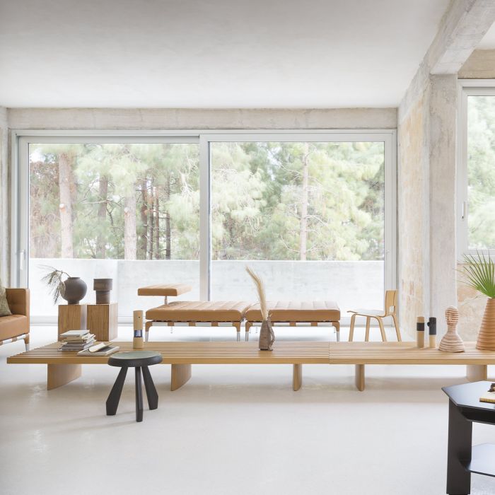Tous deux inspirés par la montagne, l'un tire son nom des bergers alpins qui utilisaient ce type de tabouret pour la traite, l'autre de la ville française chère à Perriand. Ces accessoires se distinguent par l'honnêteté des formes simples et le caractère concret exprimé par le matériau et la fonction. L'assise tournée est associée à des pieds stylisés aussi bien pour le Tabouret Berger, une variante basse avec trois pieds en bois massif tournés à la main, que pour la version haute du Tabouret Méribel avec trois pieds d'angle coupés. Réalisés par Cassina grâce à un savoir-faire soigné qui honore l'authenticité du projet, ces petits chefs-d'œuvre peuvent être utilisés individuellement ou dans des compositions d'une grande originalité. L'utilisation du bois massif communique une agréable sensation de douceur, avec la continuité du grain entre le plateau et le chant, tandis que la profondeur des surfaces dessine d'infinies variations naturelles sur chaque pièce.