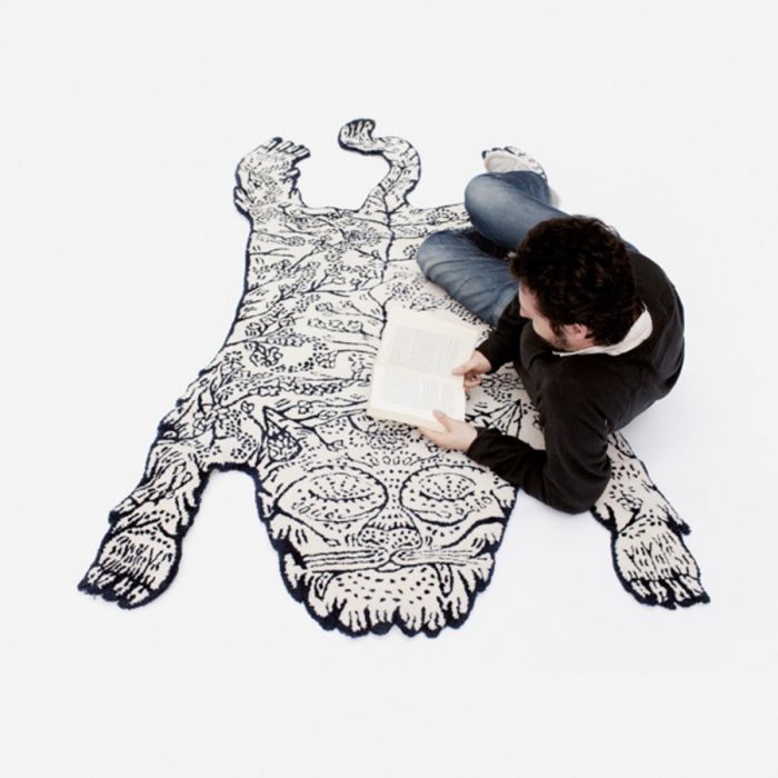Le tapis Tiger peut être vu comme une alternative joyeuse et contemporaine aux peaux de bêtes exhibées comme des trophées par les chasseurs de grands mamifères. Un pied de nez aussi! Regardez bien le Tiger de Dylan Martorell dort paisiblement. Tufté main, le tapis Tiger est fabriqué dans une très belle qualité de laine.