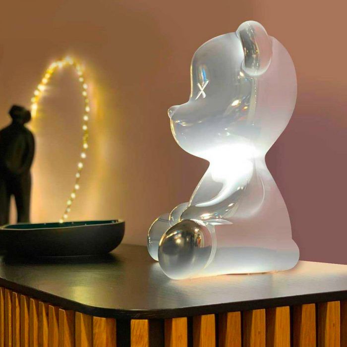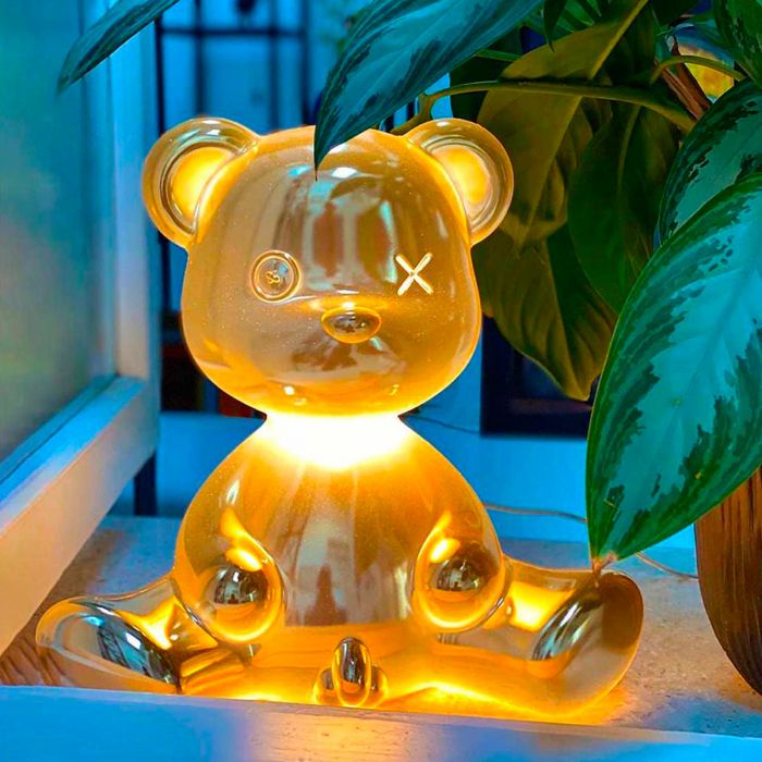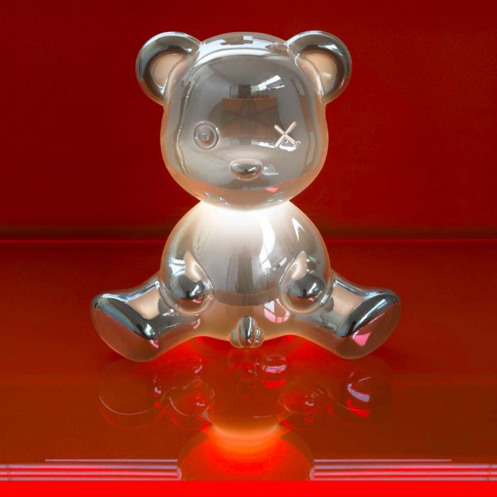 Teddy boy de Qeeboo. Conçue par Stefano Giovannoni à la manière d'un ours en peluche original, Teddy Boy est une lampe de table qui fait un clin d'œil au jouet traditionnel avec une attitude irrévérencieuse mêlant les traits de l'ours en peluche à des caractéristiques « presque humaines ». Il présente un revêtement métallique spécial qui enrichit la surface sans interférer avec la lumière. Irritant et glamour, c'est le prochain article de la liste de souhaits de tous les accros du design.