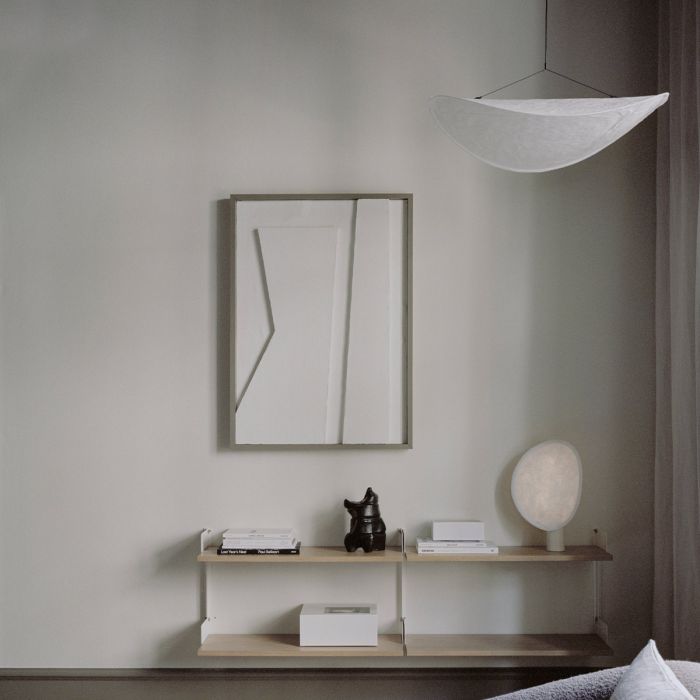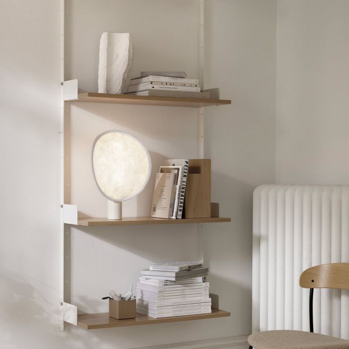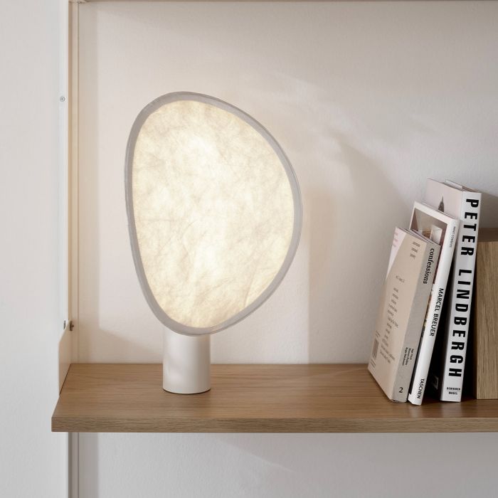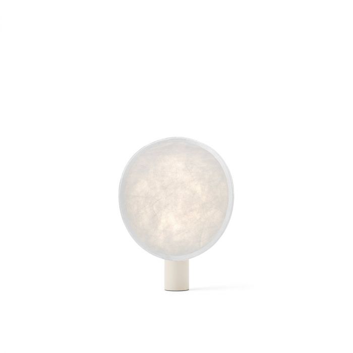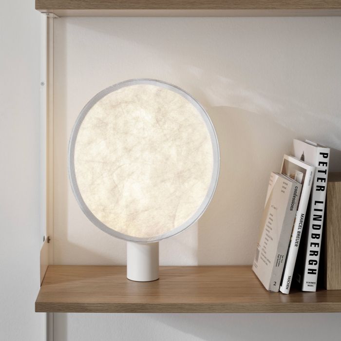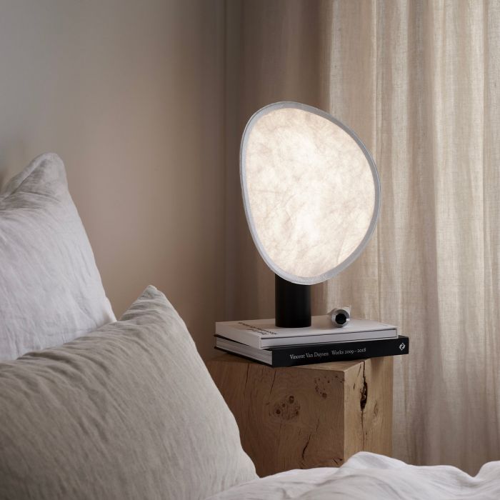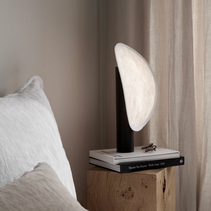 Tense lampe portable de New Works par Panter & Tourron. La lampe de table portable Tense est alimentée par batterie et peut être facilement déplacée là où la lumière est nécessaire. La température de couleur et l'intensité de la lumière peuvent être ajustées en fonction de l'environnement et de l'ambiance souhaitée. Le chargement s'effectue à l'aide d'un câble USB magnétique, qui se fixe parfaitement à la base et peut être laissé sans perturber l'expression de la lampe. Avec ses propriétés techniques étendues et ses sensations tactiles, le design de Panter & Tourron est une version esthétique et moderne d'une lampe de table. L'abat-jour aéré et semblable à un nuage qui caractérise la suspension Tense de New Works est repris dans une lampe de table atmosphérique. La forme fluide de l'écran est créée à l'aide de tiges de fibre de carbone tendues et de Tyvek léger, durable et 100 % recyclable, qui a été lavé pour obtenir un effet texturé et bouclé. Reposant dans une position presque verticale sur une base profilée, la lampe de table Tense offre de nombreuses possibilités de profiter de la belle texture du matériau et de la douce diffusion de la lumière.