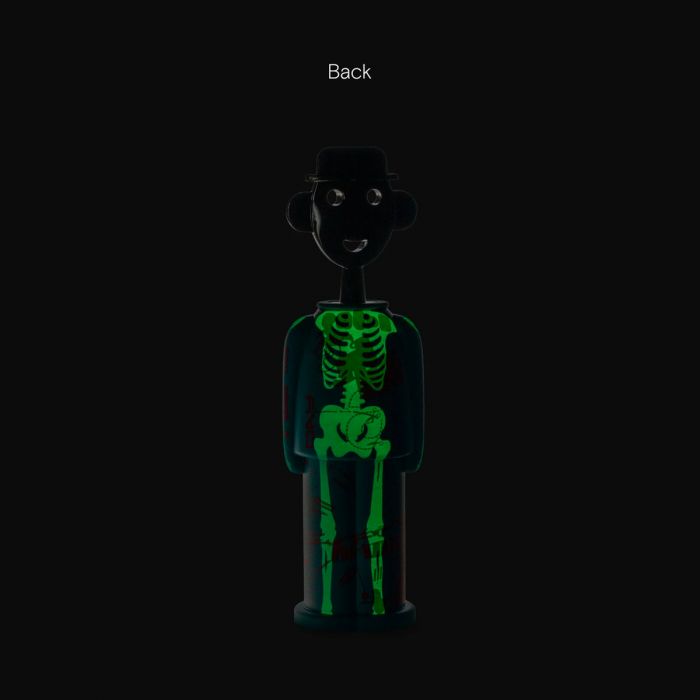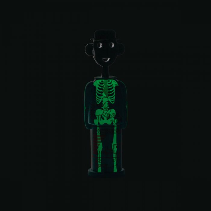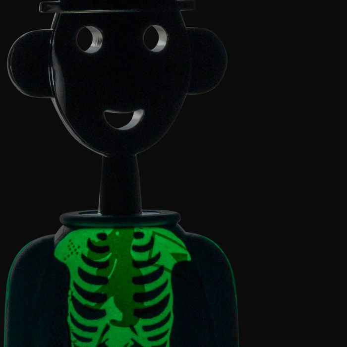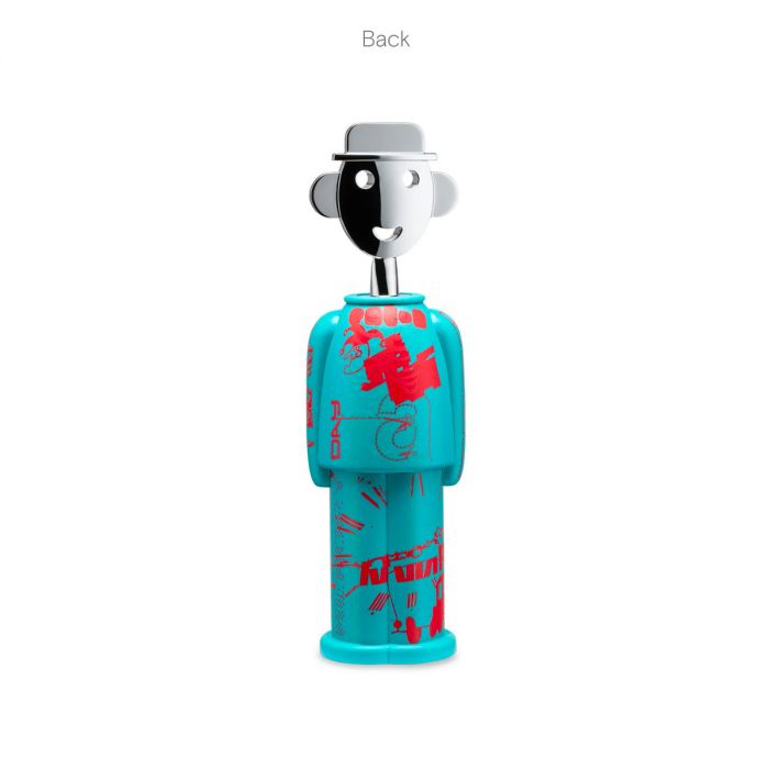Tire-bouchon Alessandro M. - Liquid de Alessi par Alessandro Mendini. Le trio créatif de Studio Temp a puisé dans le profond réservoir du street art pour créer une interprétation contemporaine et cryptique des deux tire-bouchons emblématiques d’Alessandro Mendini. Les graphismes présentés sont le reflet d’une empreinte personnelle pleine d’idées éclectiques, allant des panneaux de signalisation aux techniques modernes de protection des données. La décoration contient des éléments phosphorescents qui ne sont visible que dans l’obscurité. Corps en AlkiPaper, un biocomposite breveté à base de papier, d’autres matières premières d’origine naturelle et de composants fonctionnels.